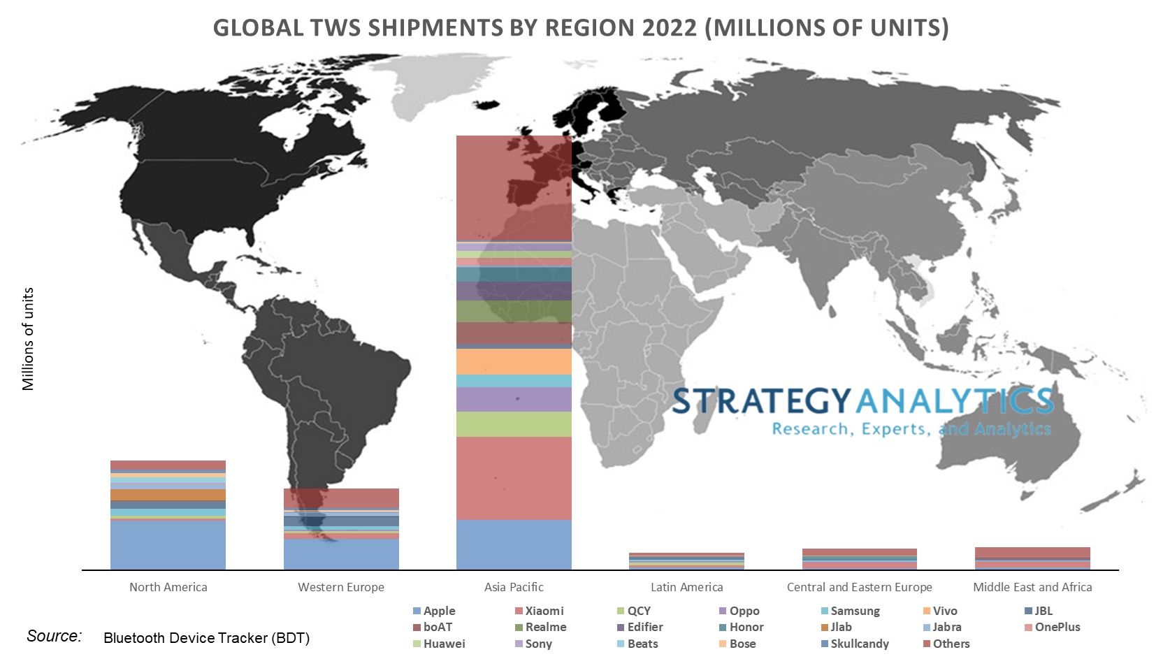 依据Strategy Analytics发布的最新数据,2022年蓝牙TWS耳机出货量将到达5亿。苹果持续坚持领先地位,但boAT、JBL和Edifier等新星将应战其领导地位,苹果商场份额将缩水。最大的商场是亚太、北美和西欧区域,但在其他区域还有许多未开发的潜力。印度是增加最快的国家,在低端设备上去除3.5mm插头推进无线耳机的运用。